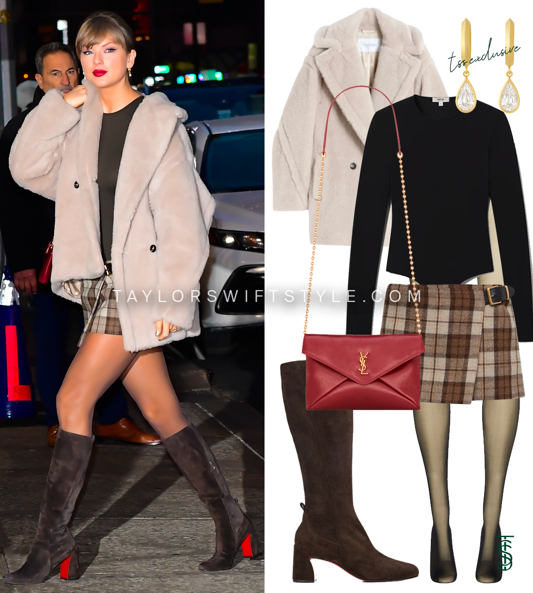 Taylor was spotted in New York, presumably en route to filming for her appearance on The Late Show with Stephen Colbert where she will be the sole guest for the show. I anticipate she’ll change clothes for her actual sitdown, but the hot streak of a black base, plaid skirt (by Miu Miu), tights, and boots holds strong for a classic winter outfit.