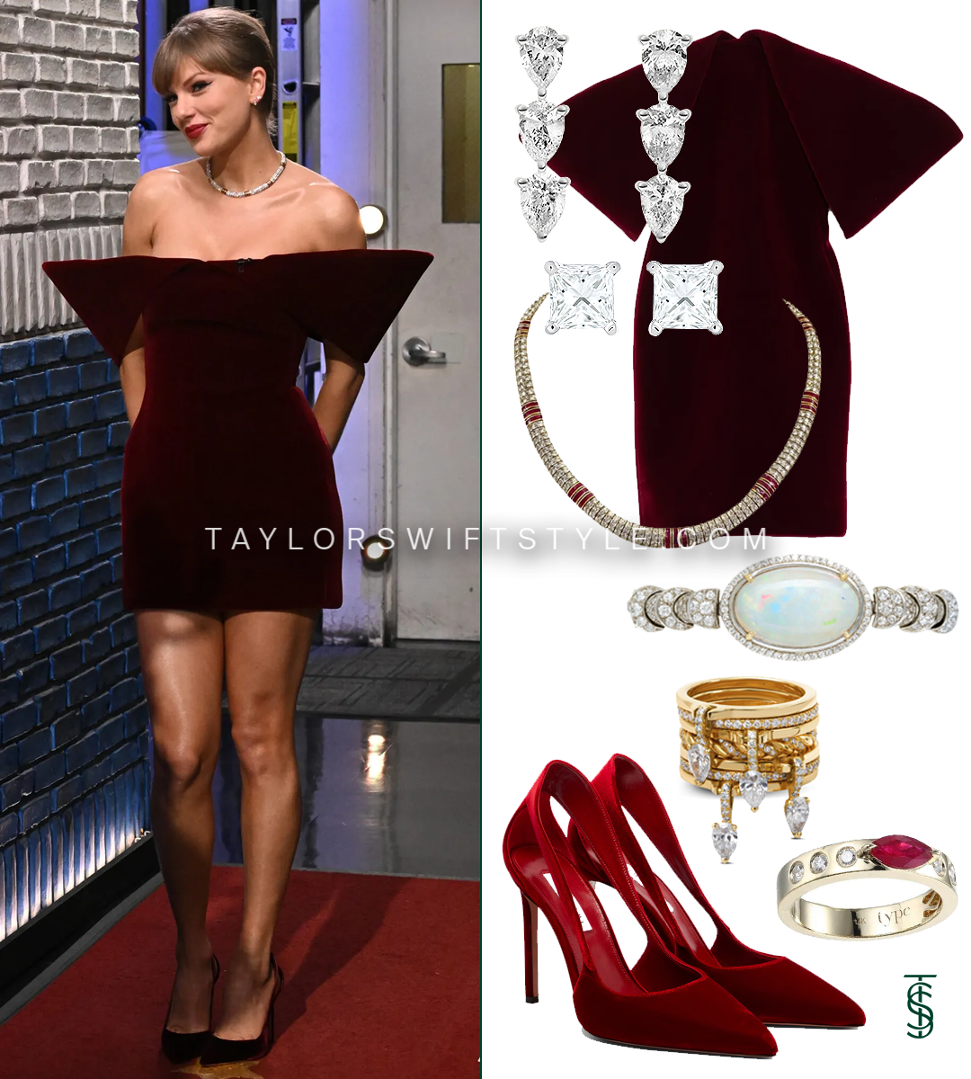 Taylor often turns to David Koma for these in-between moments like events or late night appearances. Based on the past, she’s developed a uniform of sorts. David Koma’s designs are sharp and often have a glittery moment that appeals directly to Taylor’s longstanding love of sparkles. I also love the thought behind this dress. She is the present! Much like how the entire Eras Tour felt like an over-the-top gift catered directly to fans, she’s wrapping up the Eras era (and herself) in a big red bow as she finally closes that chapter for good. I will always *always* love a bow! The red velvet not only looks lush on camera, but the architectural neckline feels whimsical and delightfully holiday-like (though perhaps a shade too low for interview close-ups?). I do think this outfit really gets captured in all its glory better standing over sitting.