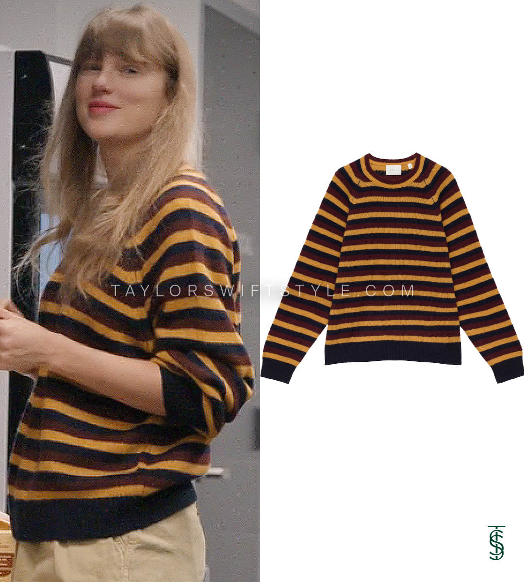 In opening scenes of Episode 5, Taylor wears a beautiful striped cashmere piece from Dôen.