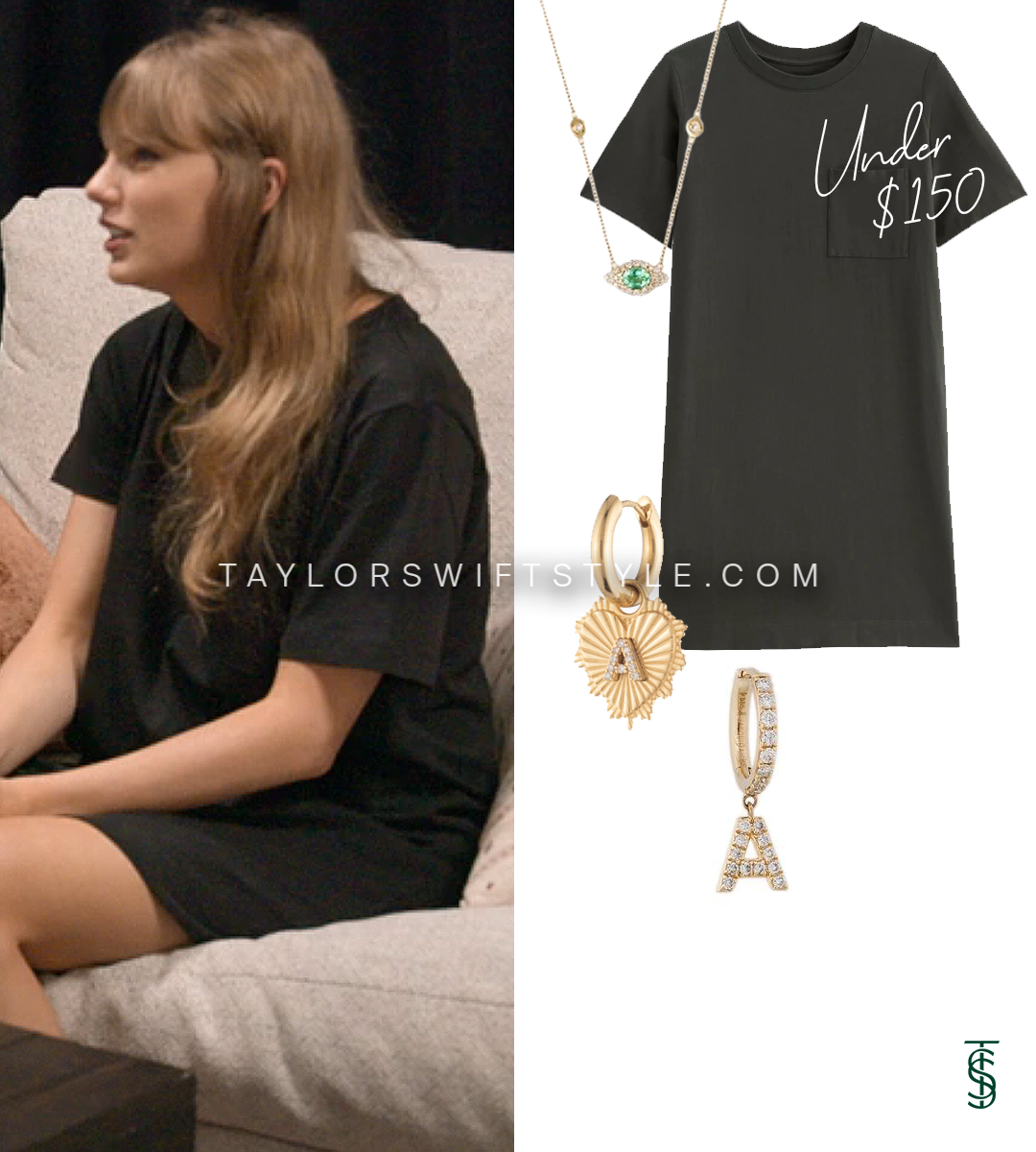 Now, the clothes. Taking a very close squint - this is my current best guess for Taylor’s pocket tee dress. Everlane is a brand I know very well (according to my digital closet app, they take up about 37% of my total wardrobe) and is one that Taylor herself has worn on a handful of occasions over the years. The stitching at the hem and sleeves and corners of the pocket appear to align and the sized up options seen on the model appear similar to the length seen on Taylor. Of course, should this be proven otherwise an update will follow.