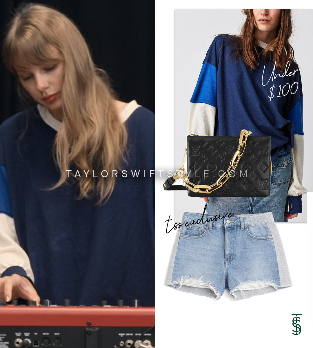 In between scenes in the third episode (“Kismet”), we see Taylor in more comfy laidback clothes including this slouchy, oversized color blocked sweater from Free People. Taylor has long worn FP pieces throughout her life. In documenting Taylor’s fashion for so long, it’s fun seeing the brands she genuinely continues to turn to, particularly when they make for a high/low when paired with a Louis Vuitton bag we’ve also seen her carry on a number of occasions.